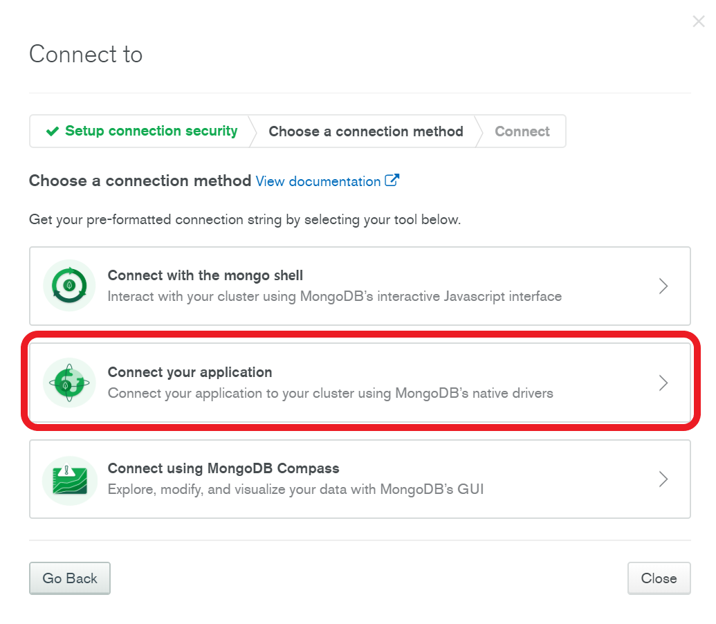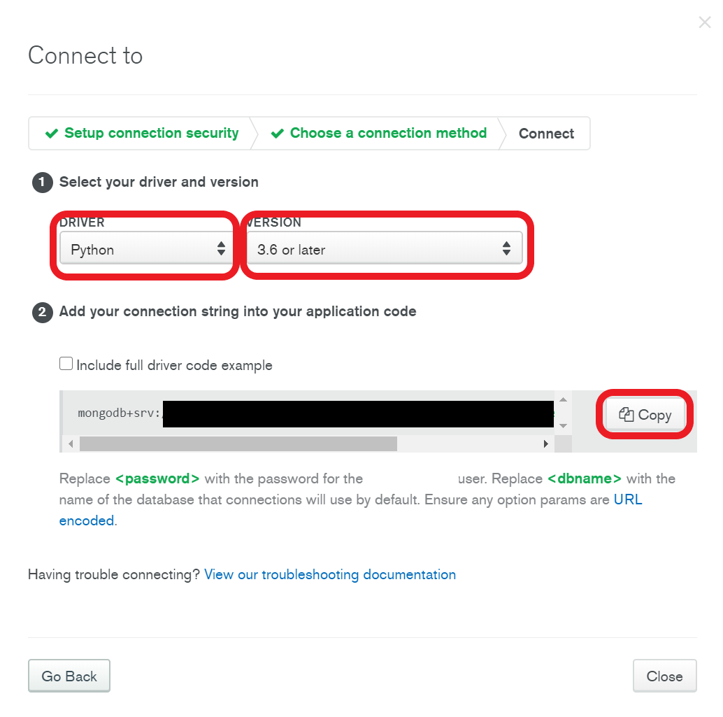 여기서 드라이버랑 버전에 맞춰서 고르시면 하단에 접속 예제 코드가 나오고 그걸 복사하시고 난 뒤 하단에 있는 것 처럼 <password> 부분에 현재 계정 비밀번호와 <dbname>에 생성한 DB이름을 작성해서