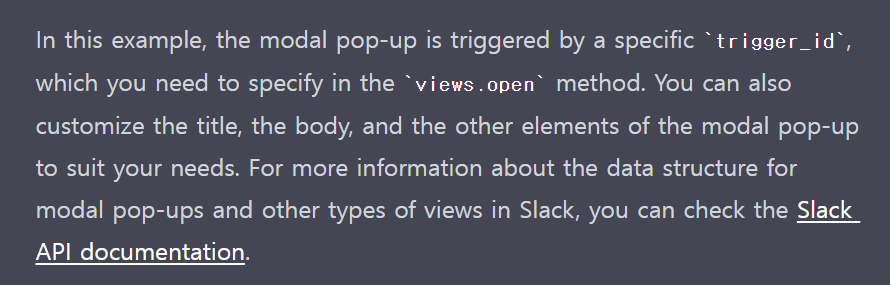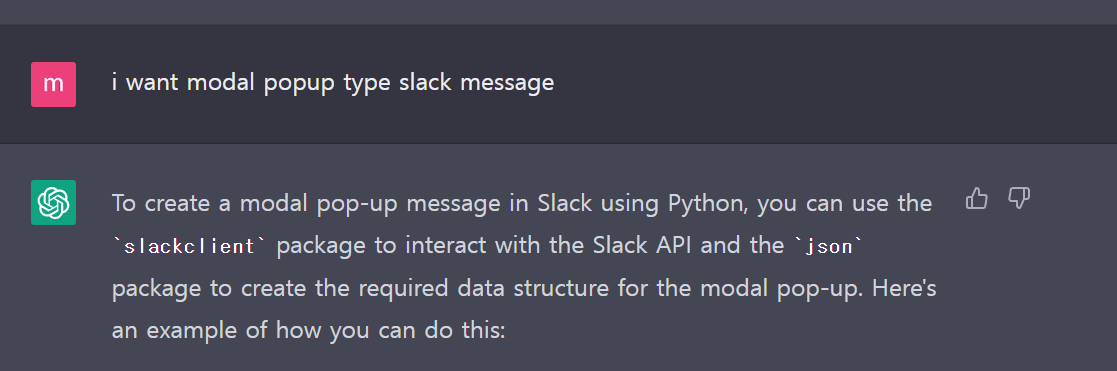 하지만 ChatGPT는 대화형 AI! 저는 다시 모달 팝업 슬랙 메시지가 필요하다고 했습니다.