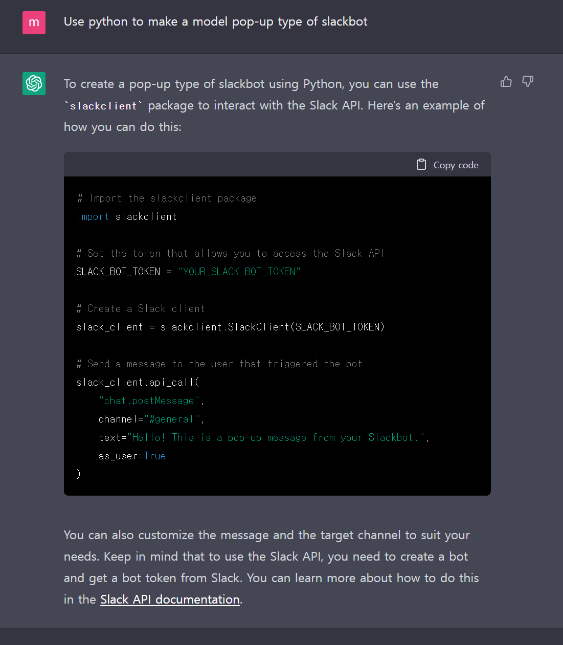 그래서 그런지 일반 슬랙 메시지를 보내는 코드를 만들어 줬습니다.