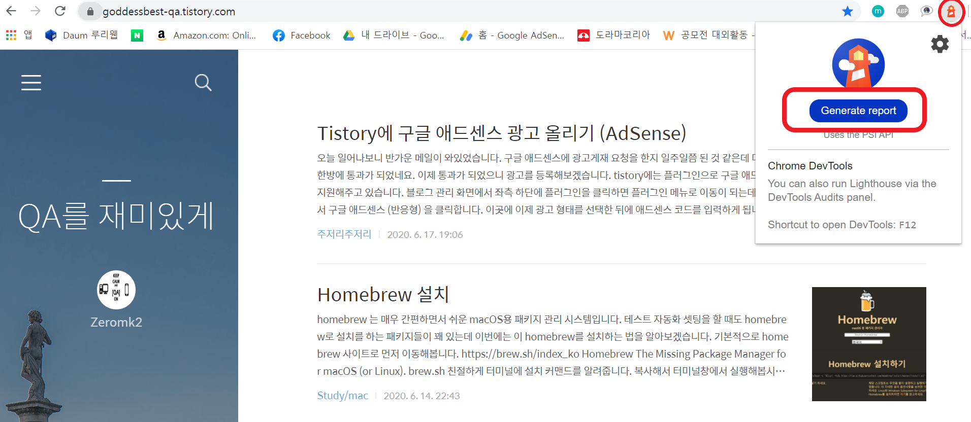 그리고 우측 상단에 Lighthouse 확장프로그램 아이콘 클릭 후 Generate report를 클릭해봅시다.