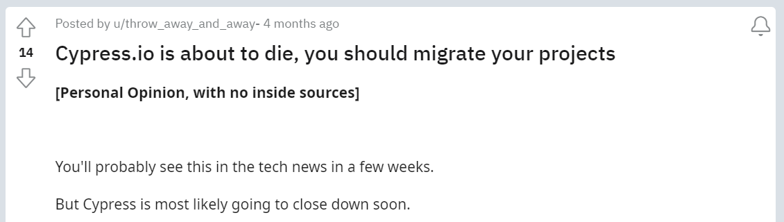 4개월 전 reddit에 cypress가 곧 shutdown 될 것이라는 추측성 글이 올라왔습니다.