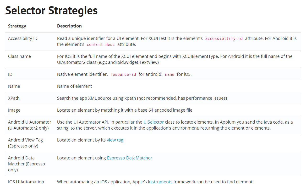 element를 선택하는 방법 (혹은 지정)은 다양한 편인데요 appium 공식 페이지에서는 이렇게 정의하고 있습니다.