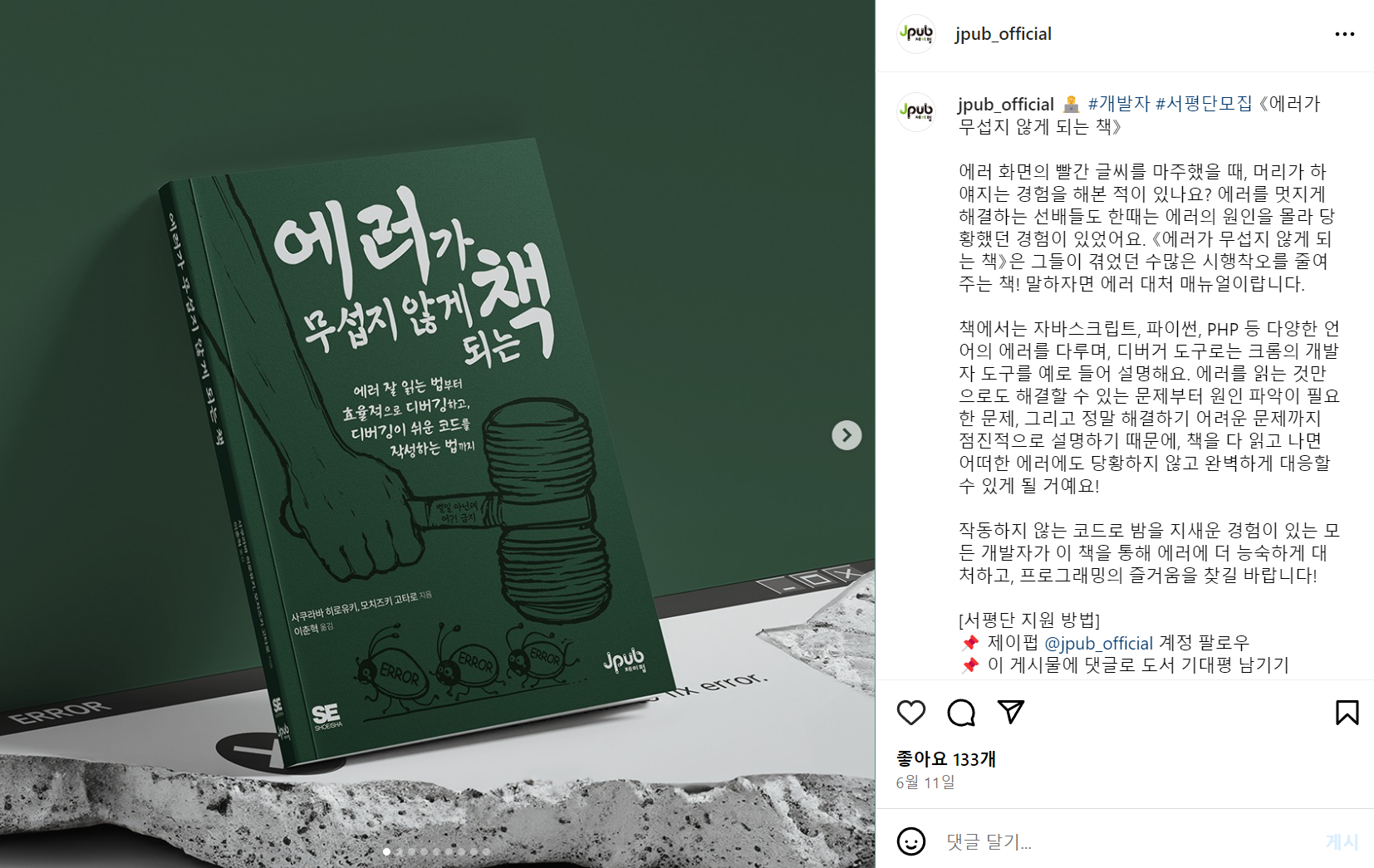 6월에 제이펍 공식 인스타그램 계정으로 도서평 이벤트 글이 올라왔습니다.