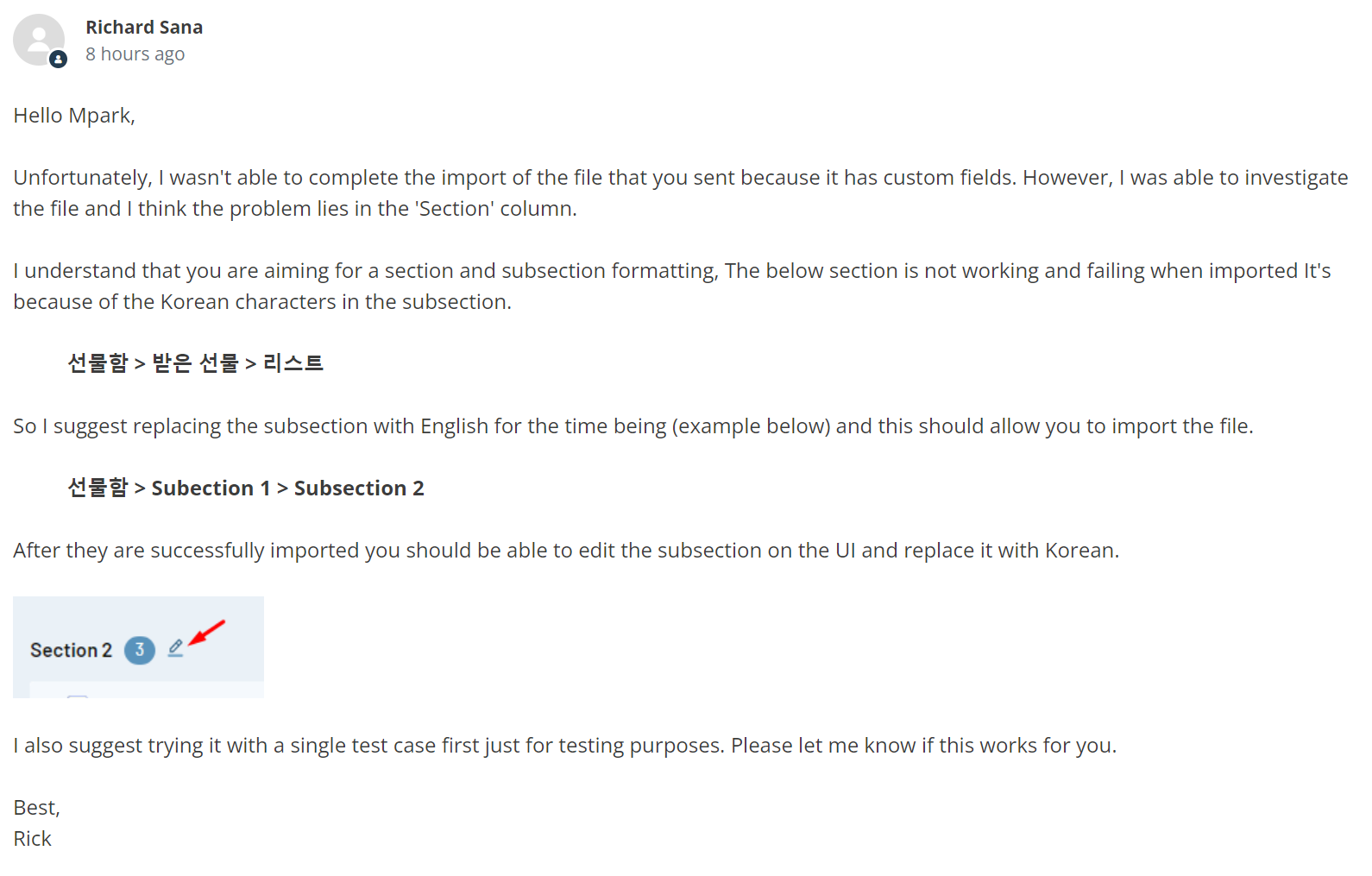 실제 import가 되지 않았던 파일도 첨부파일로 보내고 재현 방법도 상세히 적어서 문의를 남겼습니다.