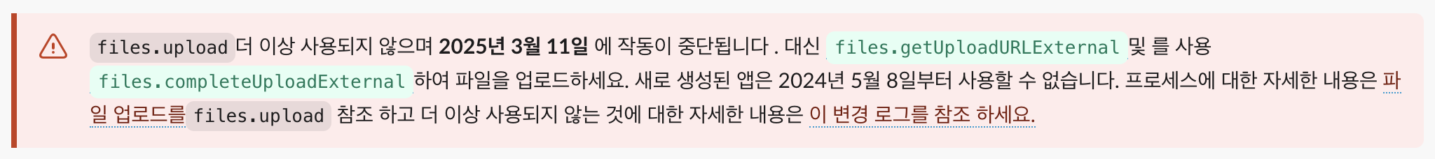 결국 위에서 이야기 하고 있는 files.getUploadURLExternal과 files.completeUploadExternal를 사용하는 방법을 찾기 시작했습니다.