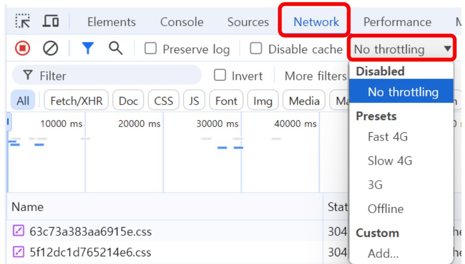 크롬 개발자도구에서 간단한 설정으로 네트워크 속도를 조절 할 수 있습니다.