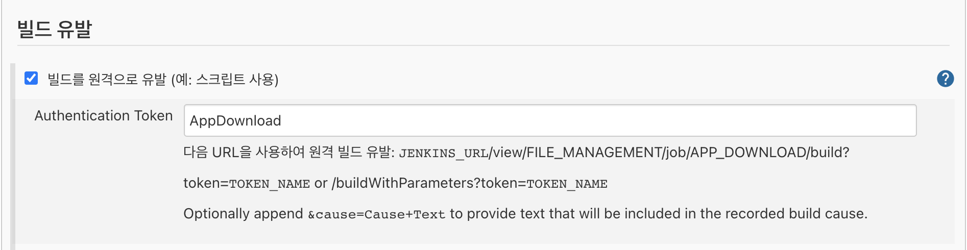 curl -X post 'http://{B Jenkins계정이름}:{B Jenkins API Token}@{B Jenkins 주소}/job/RUNNING_JOB/buildWithParameters?token=AppDownload